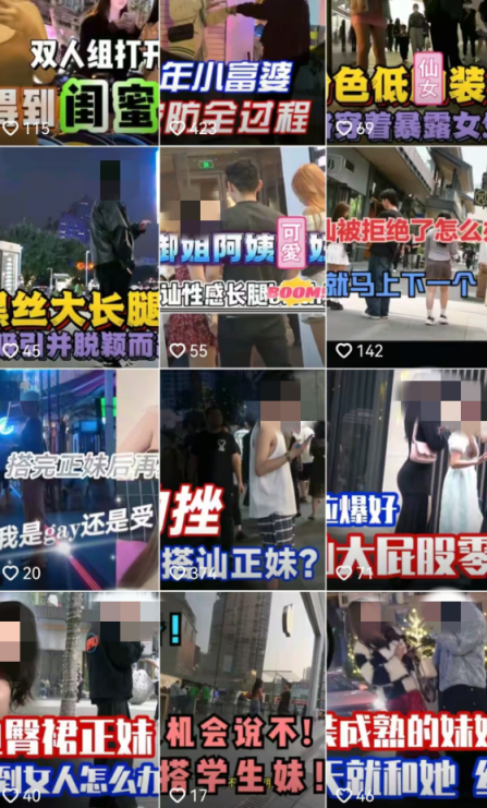 针对此类视频,不少网友表示愤怒,“以护送女性为名行公然骚扰之事”“什么时候骚扰女性成为逗乐的事情”。然而,记者调查发现,此类以“街头搭讪”“撩妹”等为噱头的“软色情”视频不在少数,其中不乏大量违背公序良俗的行为。