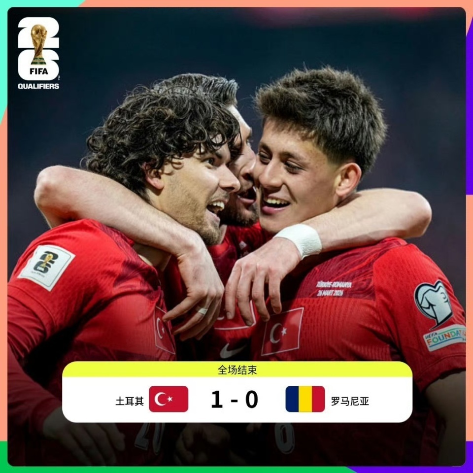 世预赛欧洲区附加赛C组半决赛,土耳其主场1-0战胜罗马尼亚晋级附加赛决赛,决赛将迎战科索沃。居莱尔长传助攻,卡迪奥卢打破僵局,伊尔迪兹中框。